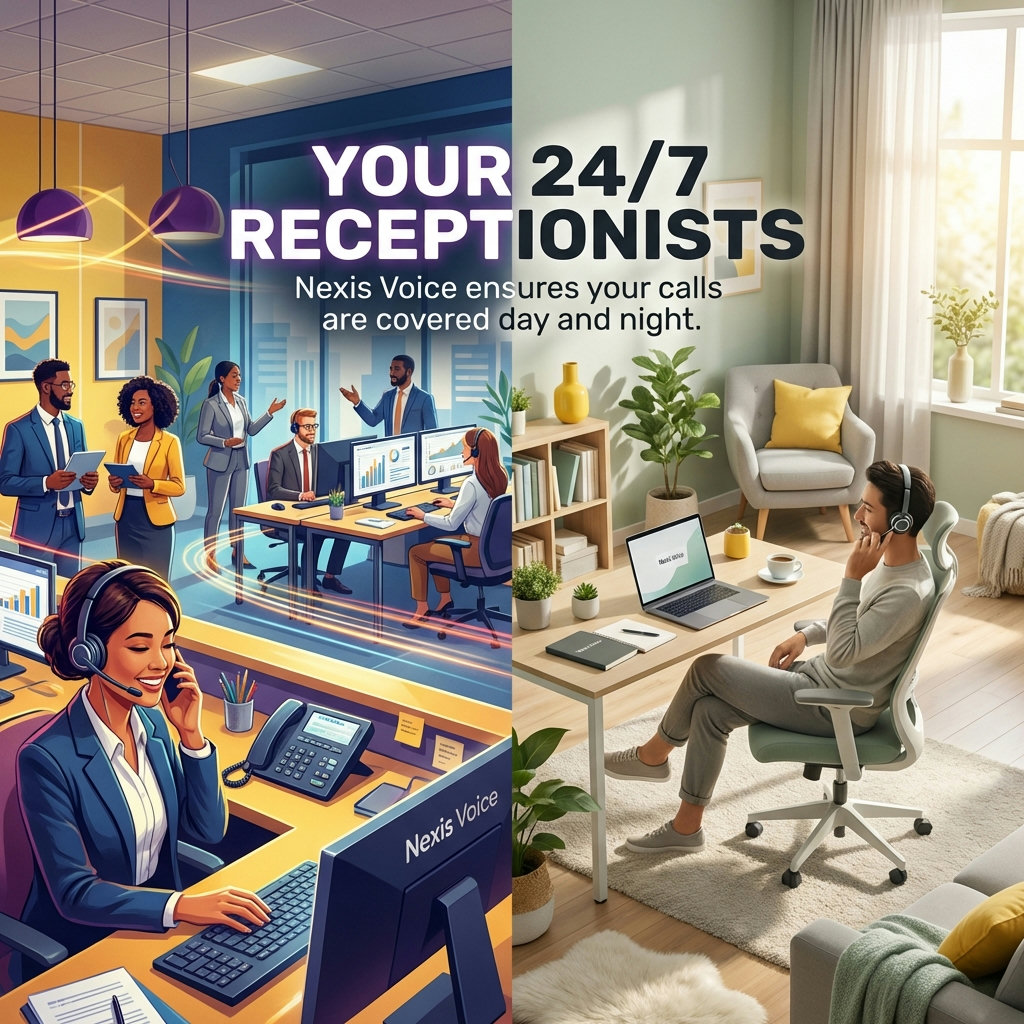 Nexis Voice is your 24/7 AI receptionist, answering calls professionally on your existing number.